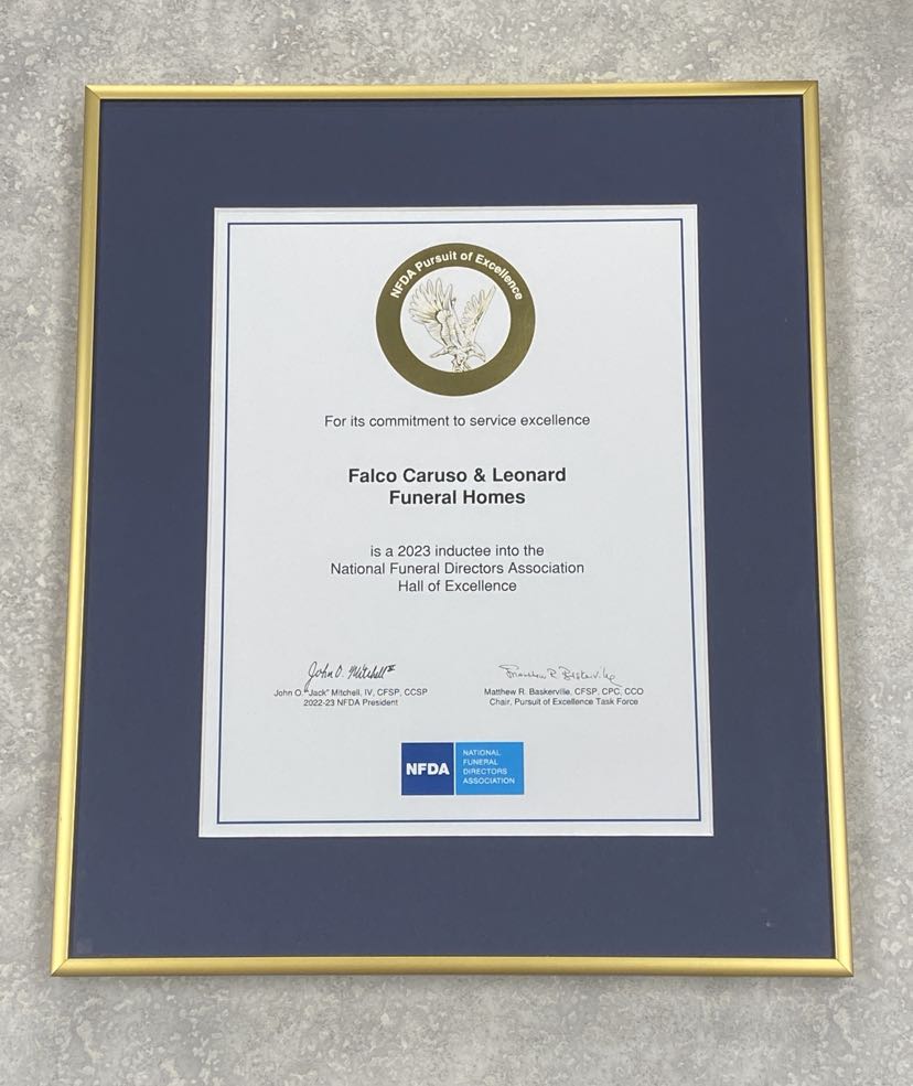 Falco Caruso & Leonard Pennsauken and Camden Funeral Homes are a 2013 - 2020 & 2022-2025 Recipient of the National Funeral Directors Association (NFDA) Pursuit of Excellence Award. The Pursuit of Excellence Award is given to NFDA-member funeral homes that fulfill required criteria in six categories of achievement. Only 153 firms from around the world receive this prestigious recognition, placing our Funeral Homes among an elite group of funeral service providers.